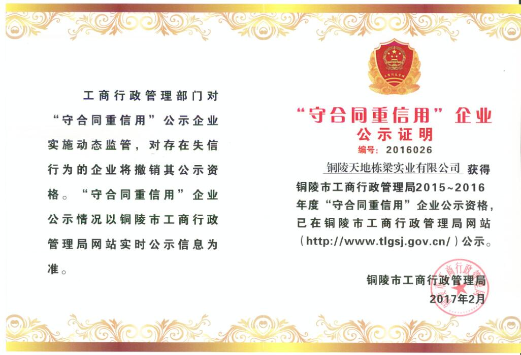公司榮獲2015-2016年度市級“守合同重信用”企業(yè)